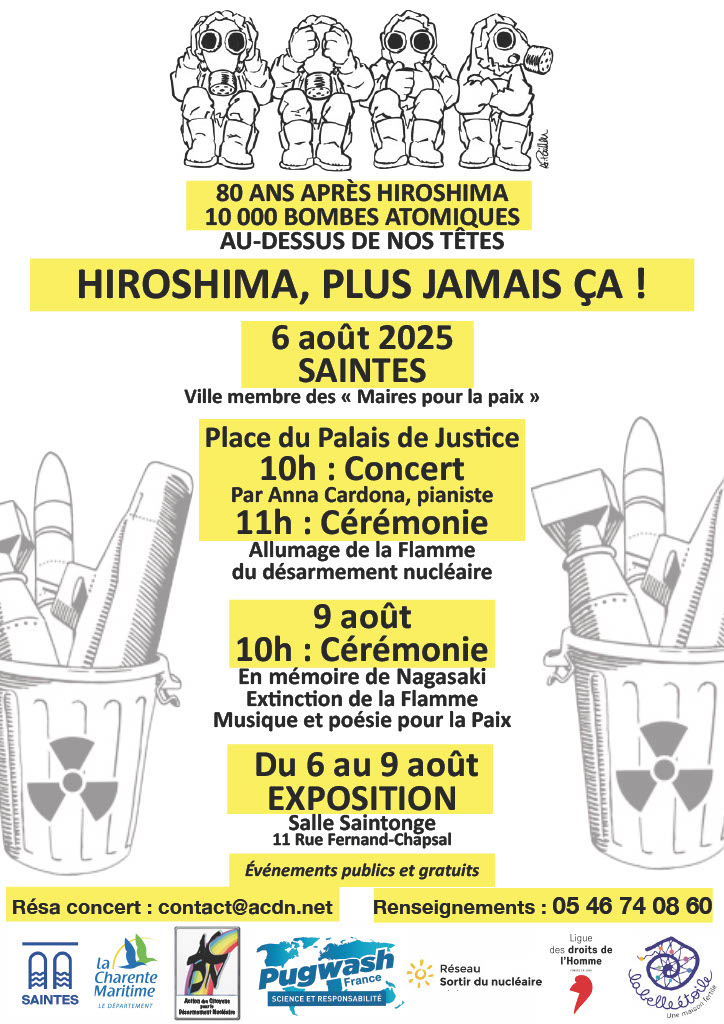 Nous invitons tou(te)s nos concitoyen(ne)s et leurs élu(e)s de tous bords à la manifestation du 6 août à Saintes, place du Palais de Justice. Elle commencera par un concert d’Anna Cardona Esteva à 10h précises (accueil à partir de 9h 30).